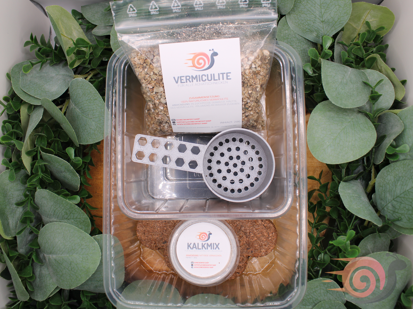 After hatching, the snails go into the 1l rearing box. For these, 2 small coconut blocks and a calcium/mineral mix are included for adding calcium to the soil. The mix contains not only calcium but also some minerals to enhance the contentless coconut humus.